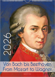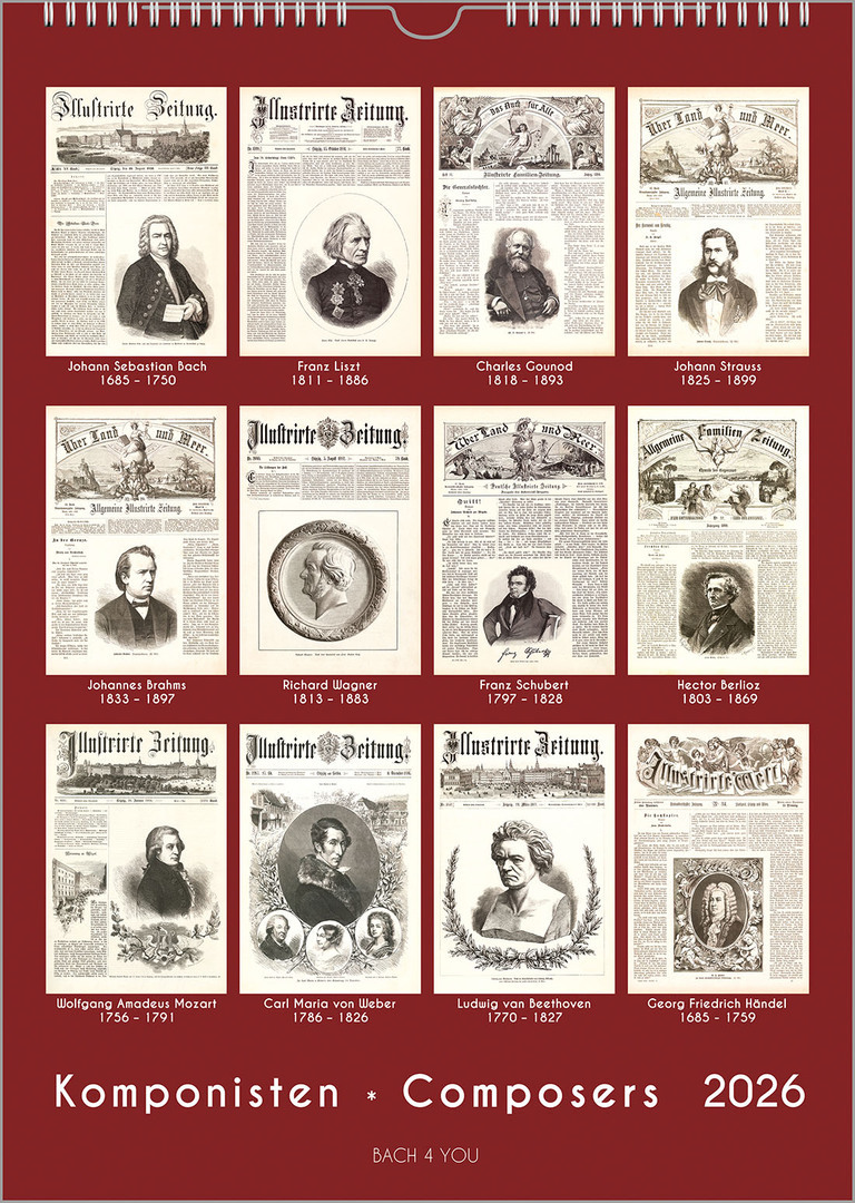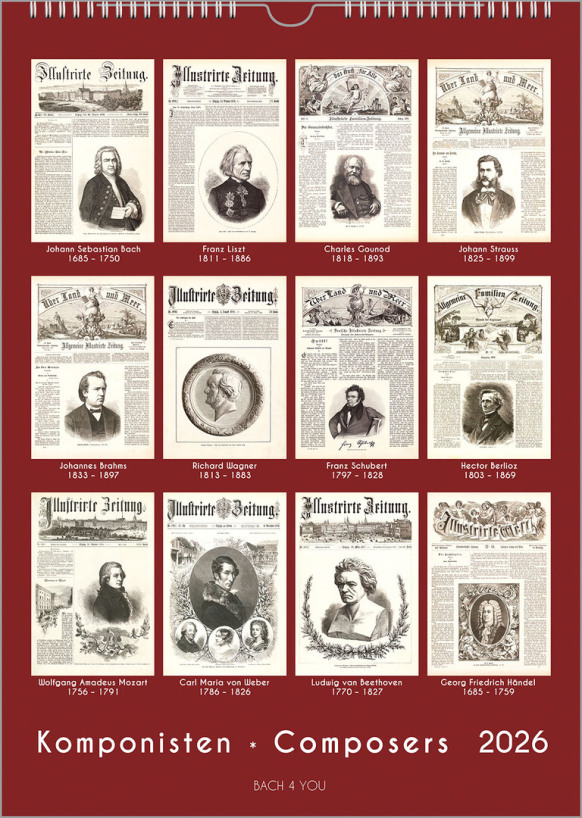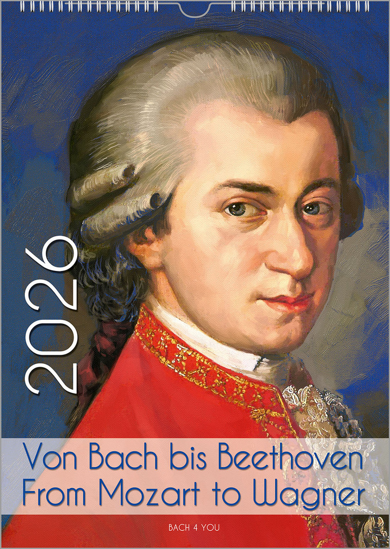 One composers calendar. Actually a print on demand composers calendar. Among 20 composers calendars. Actually, this calendar does not belong here on the one hand. As it is not related to the Bach genealogy. On the other hand, it is about historic stuff, Bach is one of the displayed composers and finally this whole website is a promotion for my friends' project and "Bach Mission". If you are now excited by this composers calendar, why don't you research the other 19 composers calendars and the 59 more Bach calendars and music calendars? Please click here to get to the "Bach 4 You" Publishing Company's shop. However, please hurry back after your experience, please.